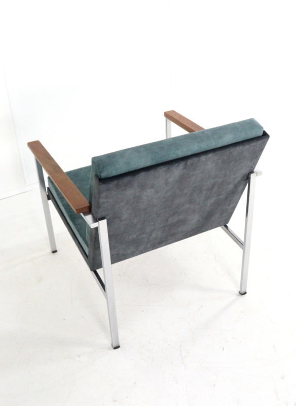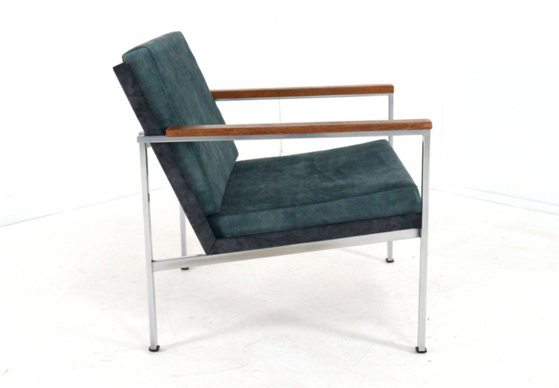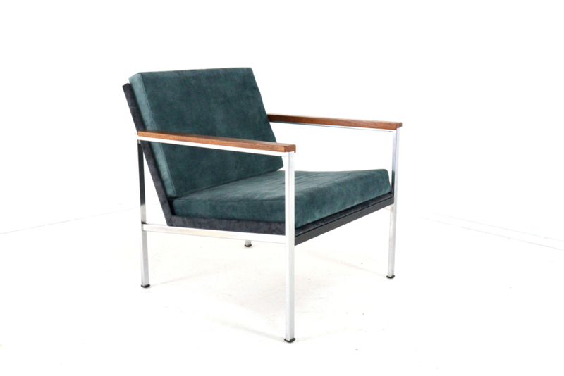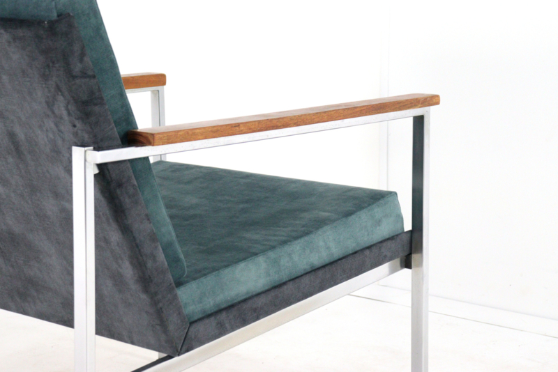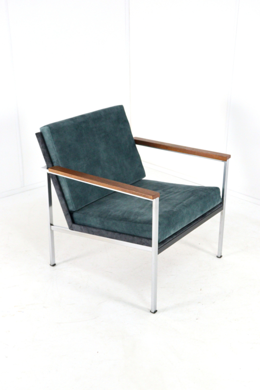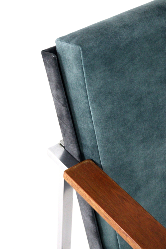 De fauteuil kenmerkt zich door een strak en uitgebalanceerd silhouet met een verchroomd stalen frame, houten armleggers en royaal gestoffeerde zit- en rugkussens. Het harmonieuze samenspel tussen metaal, hout en textiel is typisch voor de mid-century modern stijl: licht ogend, eerlijk in materiaalgebruik en ontworpen vanuit functionaliteit. Subtiele luxe wordt hier bereikt door eenvoud en verfijnde verhoudingen, zonder overbodige decoratie.