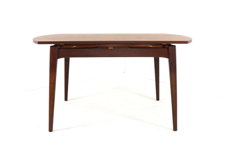 Een mooi voorbeeld hiervan is deze tafel, waarbij hij zowel de meubelwereld als de gebruikers een totaal nieuw model voorschotelde. Niet een ronde tafel met een tuimelblad, niet een uitschuifbare ronde tafel met een tussenblad, maar een rechthoekige tafel met 2 ronde uiteinden werd de basis voor dit unieke model, die ook wij maar zelden voorbij zien komen.