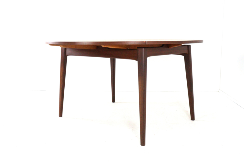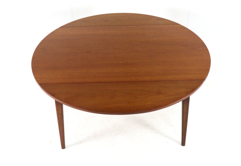 Onder de beide rechte stukken is een constructie gemaakt om de tafel uit te breiden tot een rond model met een totale diameter van 140 cm. Zoals gezegd, anno 2026 uitermate schaars. Een "normale" ronde tafel is doorgaans 100 centimeter doorsnede, en af en toe zie je nog een tafel met een doorsnede van 120 centimeter. Deze Louis van Teeffelen tafel is dus 140 centimeter groot en naar onze inschatting zeker geschikt om aan te schuiven met 5 tot 6 personen.