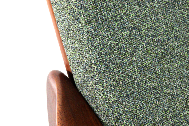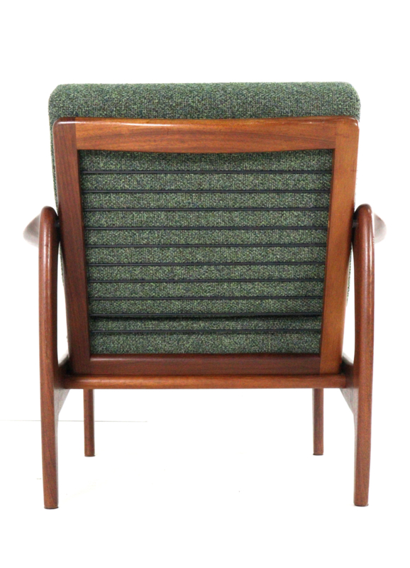 De bekleding is geheel door vakmensen vervangen. Er is gekozen voor een fraaie groene melange meubelstof, extra zacht en met fraai reliëf met een schakering van diverse kleuren groen, buitengewoon fraai!