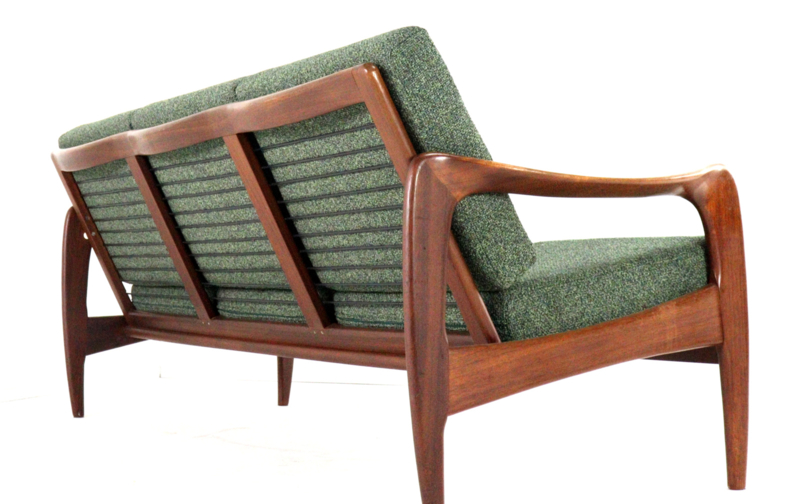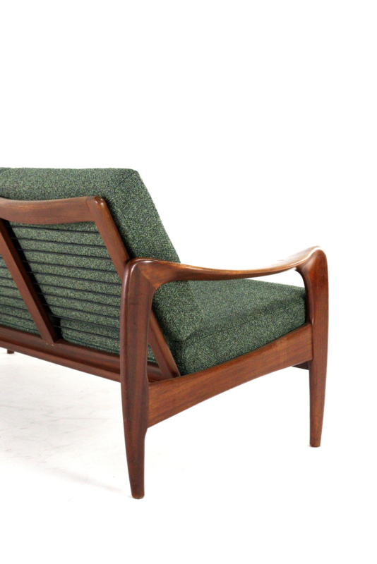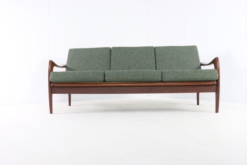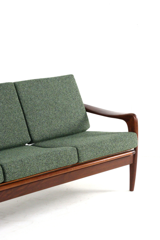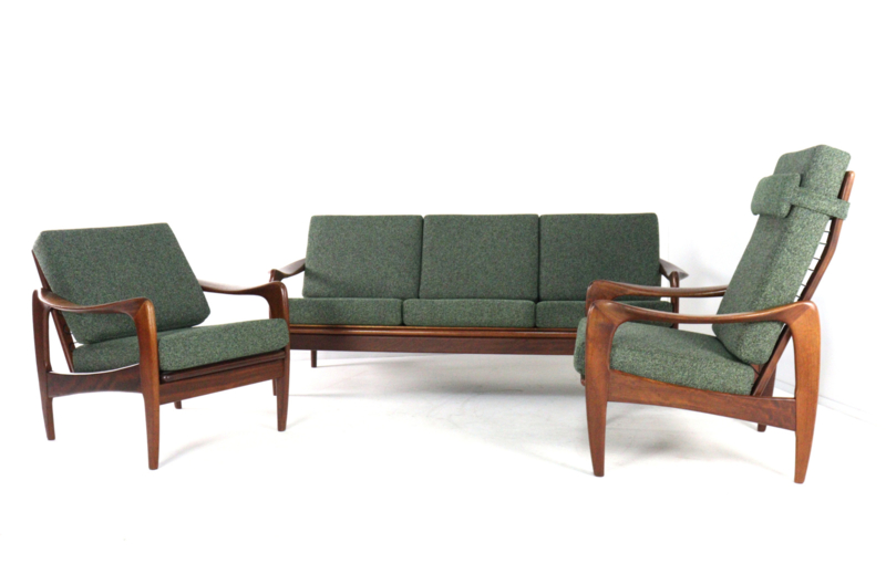 De bekleding is geheel door vakmensen vervangen. Er is gekozen voor een fraaie groene melange meubelstof, extra zacht en met fraai reliëf met een schakering van diverse kleuren groen, buitengewoon fraai!