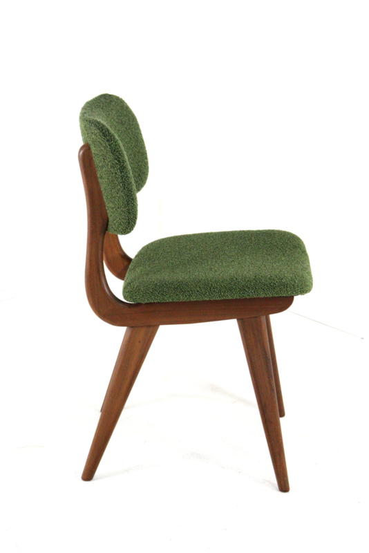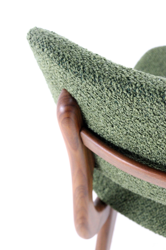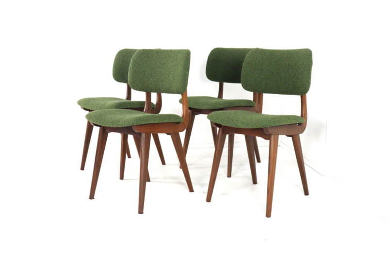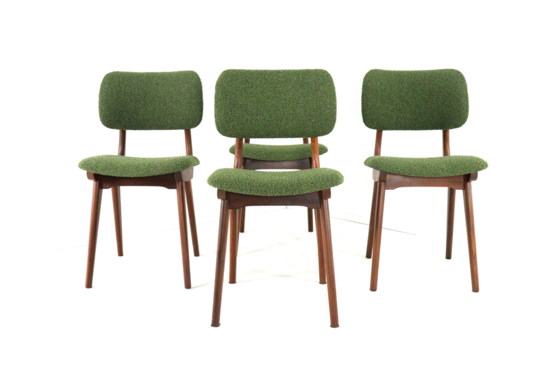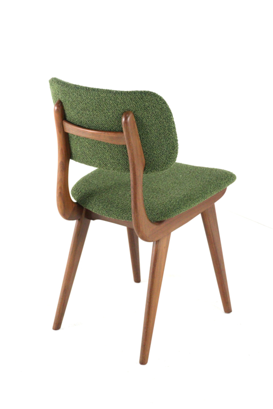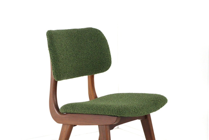 Daar boven op zijn afgeronde zittingen en rugleuningen aangebracht, deze zijn geheel opnieuw gevuld en bekleed met een eerste klas meubelstof type "Odense" in fraai groen.