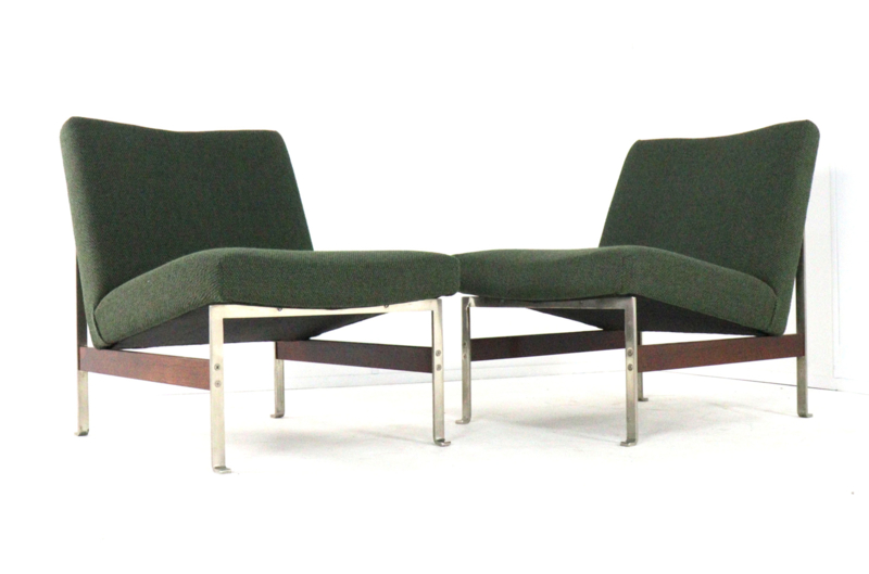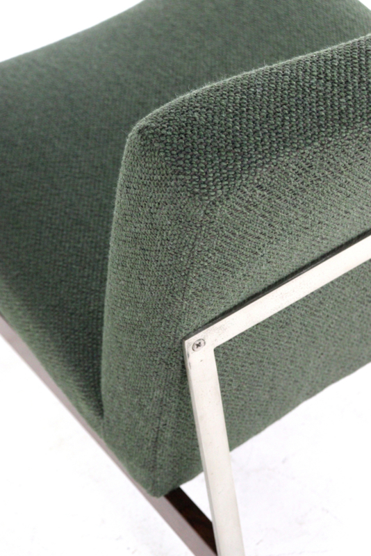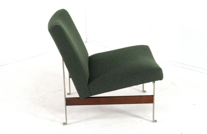 De fauteuil is geheel gerestaureerd met respect voor het oorspronkelijke ontwerp en vakmanschap. De bekleding is vernieuwd met een hoogwaardige, zware groene geweven meubelstof die niet alleen duurzaam is, maar ook een rijke, warme uitstraling geeft. Het slanke metalen frame is zorgvuldig gereinigd en waar nodig opnieuw afgewerkt, zodat het zijn strakke, architectonische karakter volledig behoudt. De palissanderhouten ligger tussen de poten is opgefrist en vormt een stijlvol, warm contrast met het metaal en de diepe groentint van de stoffering.