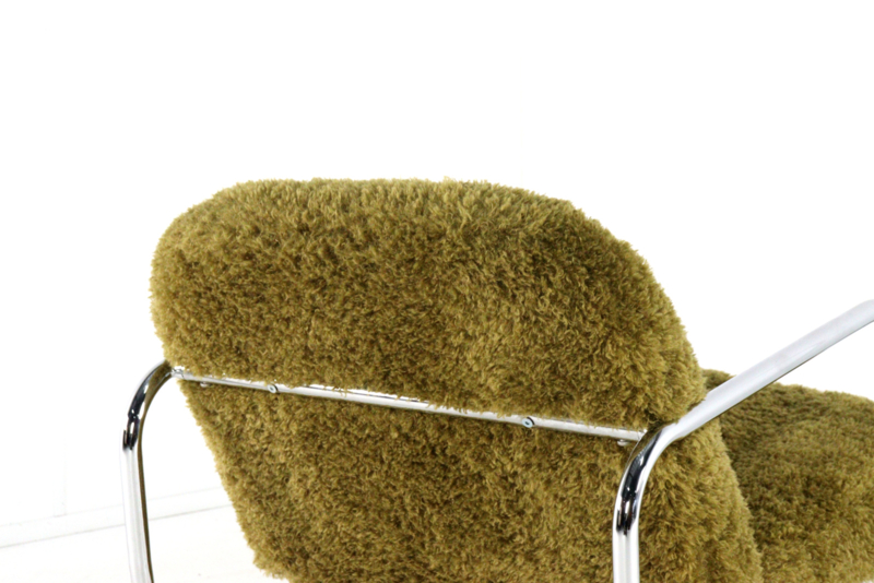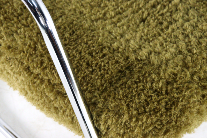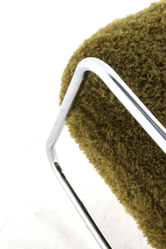 De stoel is opnieuw gestoffeerd met de trendy stof Doodle in de kleur Army. Deze langharige stof heeft een speelse, rijke textuur die niet alleen heerlijk zacht aanvoelt, maar ook zorgt voor een stijlvolle en eigentijdse uitstraling. De fraaie Army-groene tint vormt een mooi contrast met het glanzende metalen frame en laat het ontwerp extra goed tot zijn recht komen.