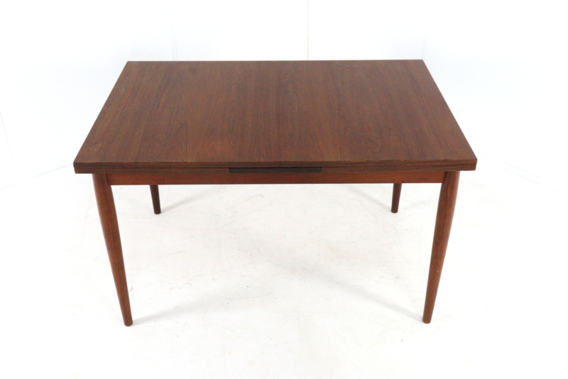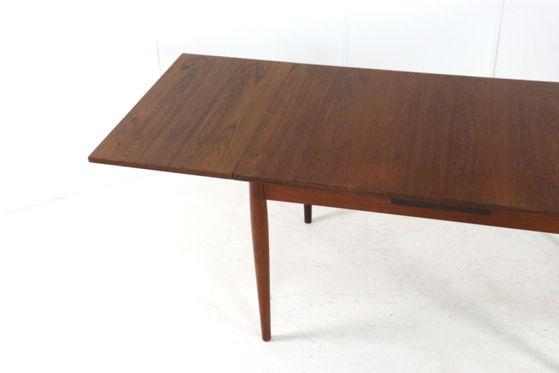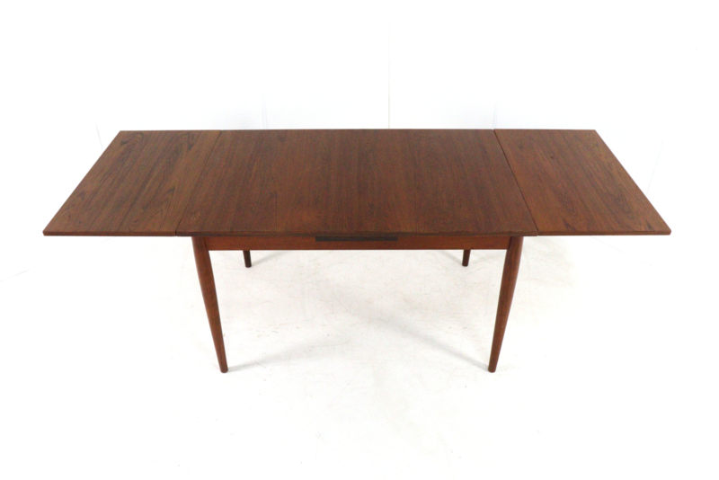 Deze fraaie eetkamer tafel is in een gerestaureerde, en direct inzetbare nette staat, typerend voor het warme teak is is de mooie tekening in het hout.