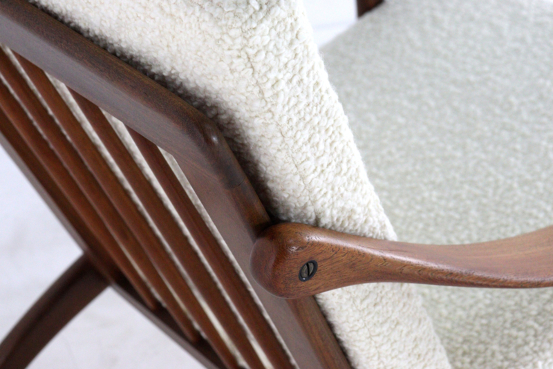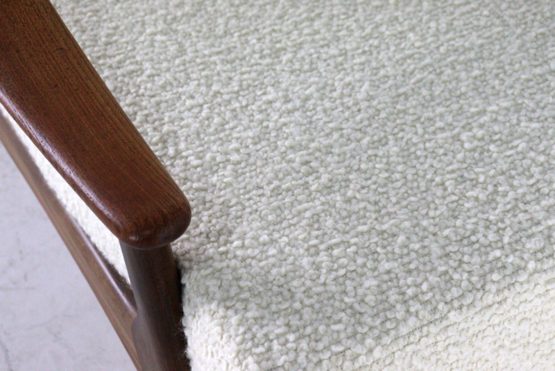 Deze specifieke fauteuil is volledig gerestaureerd en voorzien van een nieuwe vulling voor optimaal comfort. De keuze voor een zeer exclusieve Deense wollen meubelstof met een grove bouclé-structuur versterkt het unieke karakter van de stoel.