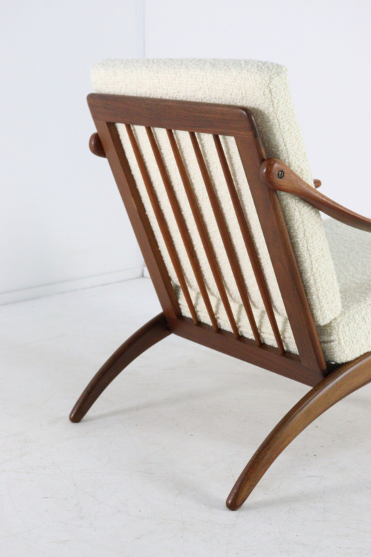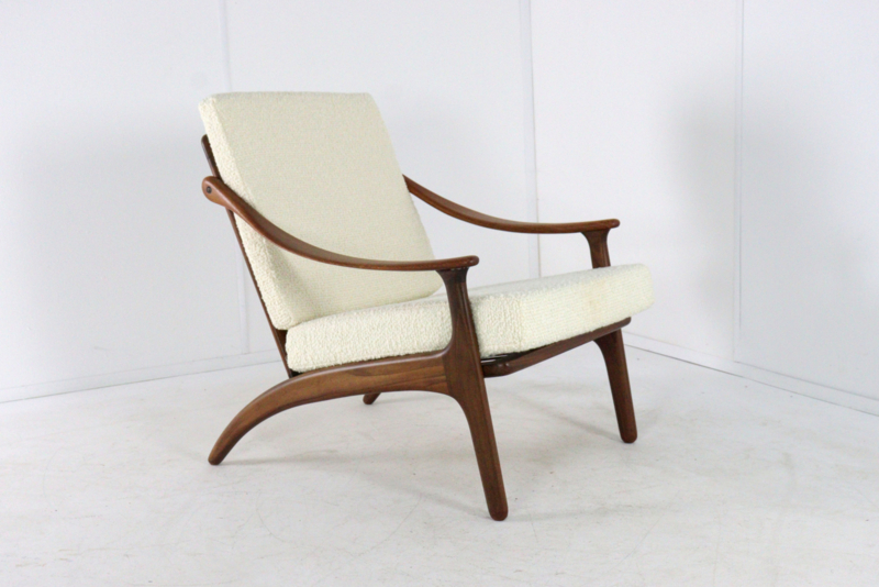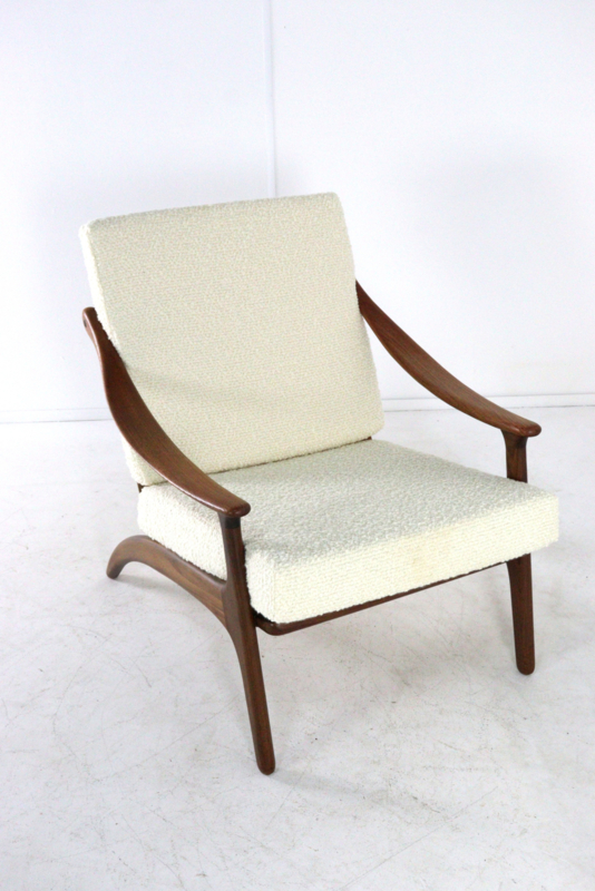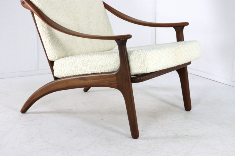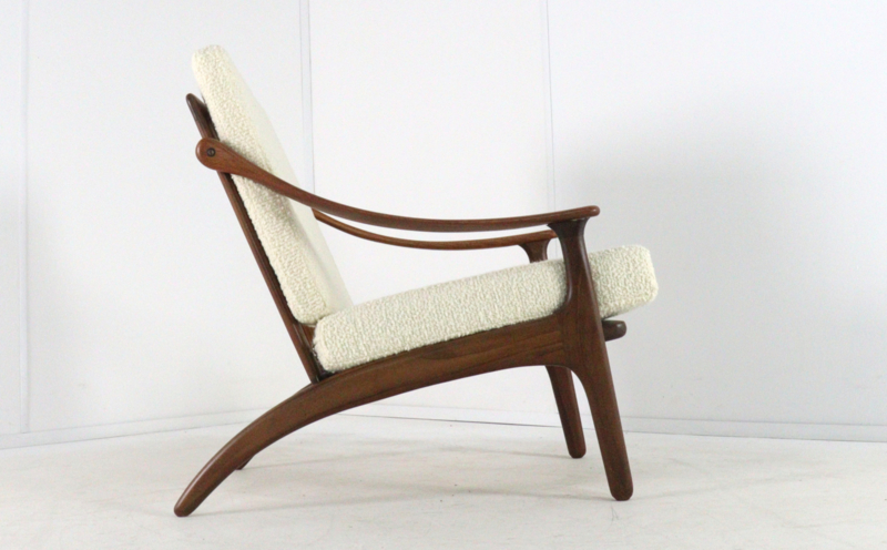 Artikelnummer: FAUT-25-107Deze iconische fauteuil van Arne Hovmand-Olsen voor Komfort is een meesterlijk voorbeeld van Deens design op zijn best. Het ontwerp valt direct op door de organische, vloeiende lijnen van het massief teakhouten frame, waarbij de armleuningen met een bijna sculpturale elegantie lijken te zweven.