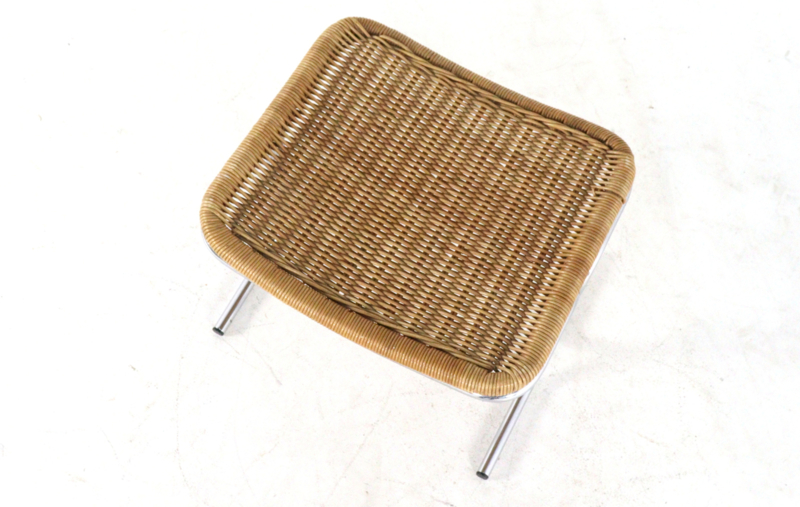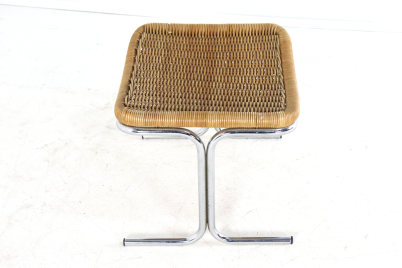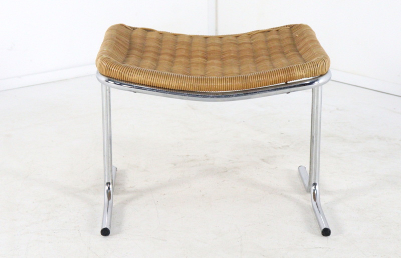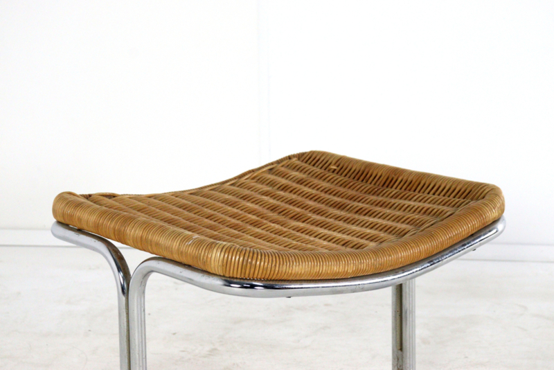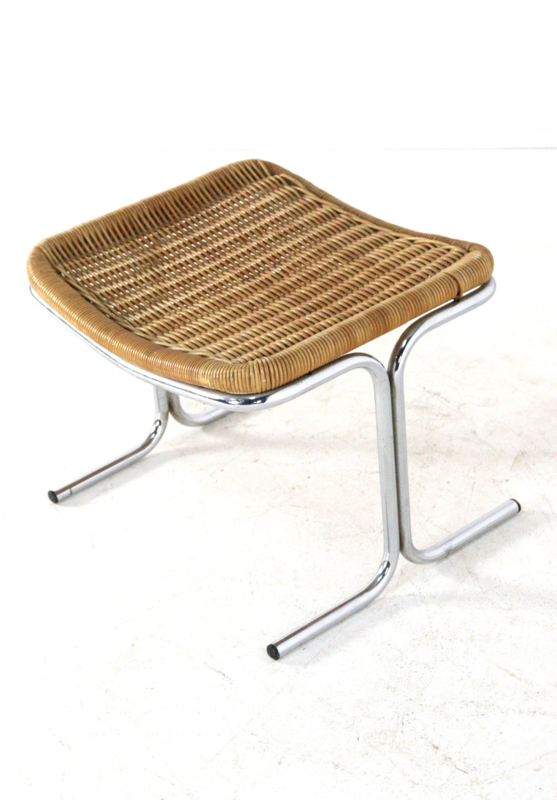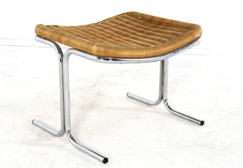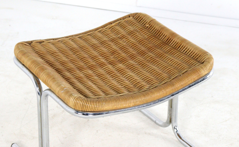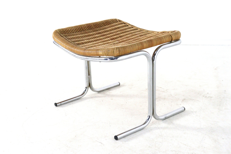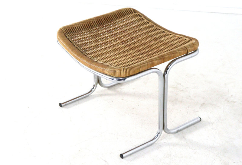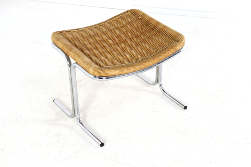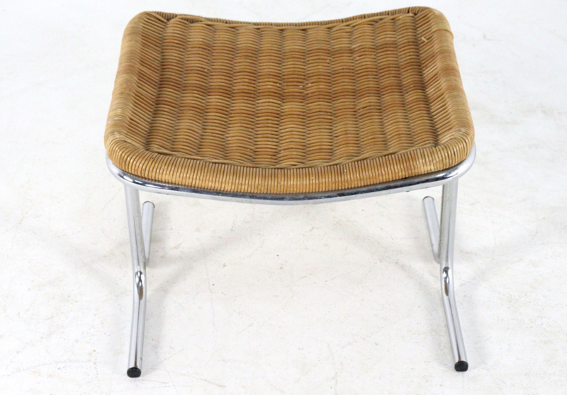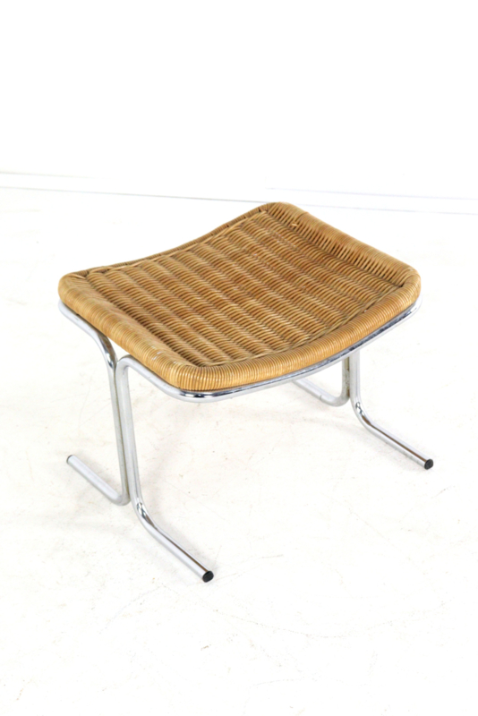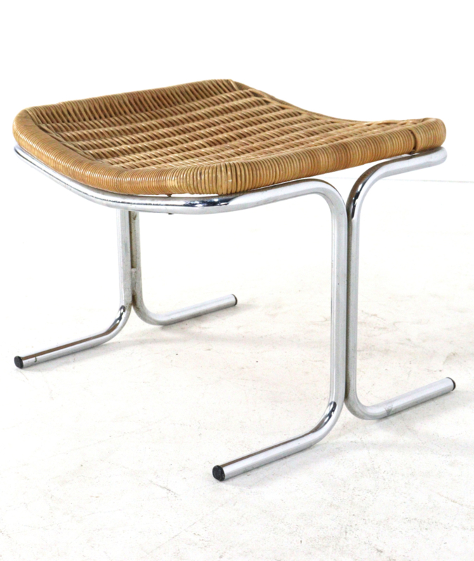 Dit stijlvolle vintage voetenbankje is een prachtig voorbeeld van nuchter Nederlands design uit de jaren vijftig en zestig. Ontworpen door Dirk Sliedregt voor de Gebroeders Jonkers, brengt dit meubelstuk een mooie balans tussen industrieel materiaal en natuurlijk vlechtwerk. Het ontwerp valt direct op door het strakke, verchroomde buisframe dat met zijn open vormgeving een luchtige uitstraling geeft aan de ruimte.