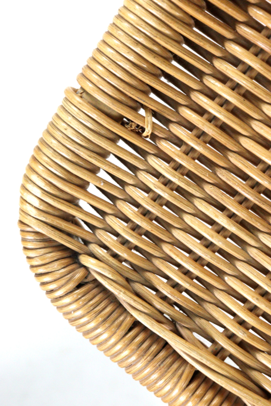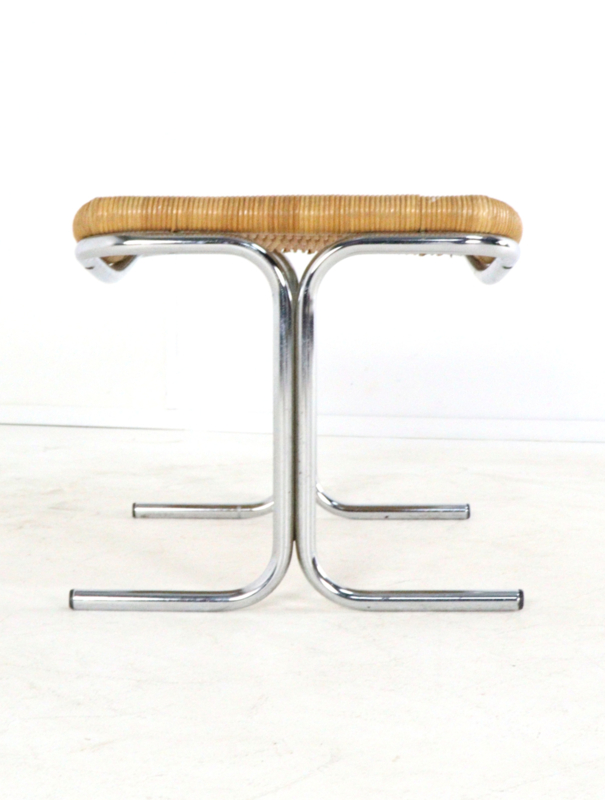 De zitting is vakkundig gemaakt van rotan en heeft een licht gebogen vorm. Met zijn compacte afmetingen van 46 bij 42 centimeter is het een handig en verplaatsbaar item voor in huis. Dankzij de combinatie van glanzend metaal en warm riet voelt het bankje zich in veel woonstijlen thuis. In een modern interieur zorgt het voor een vriendelijke, organische touch, terwijl het in een woning met veel hout of vintage meubels juist de authentieke Mid-Century sfeer versterkt. Het is een tijdloos item dat laat zien hoe sterk de kracht van eenvoud kan zijn.