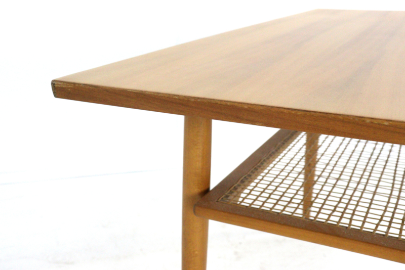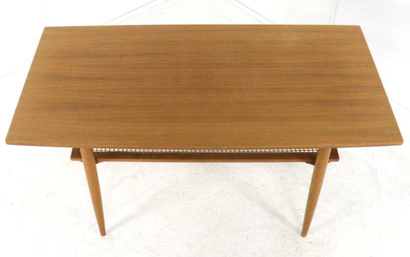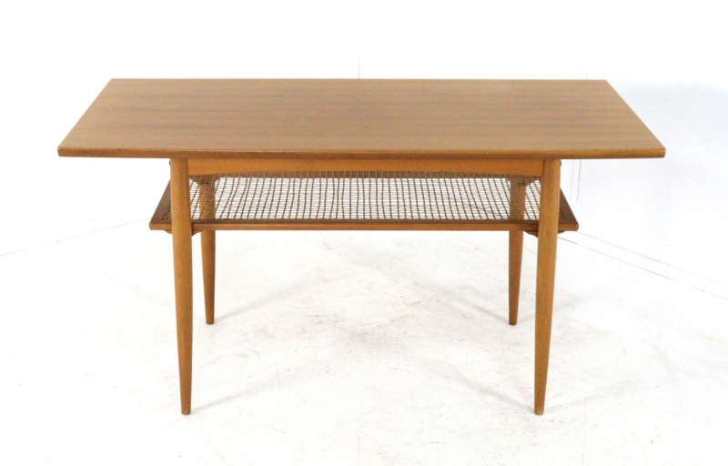 Met zijn warme houttinten en slanke, taps toelopende poten geeft deze tafel de iconische jaren ’60 stijl perfect weer. Het ontwerp is niet alleen prachtig, maar ook erg praktisch: onder het ruime bovenblad vind je een plateau van verfijnd vlechtwerk voor je tijdschriften. Bovendien is het blad voorzien van een welhaast onzichtbare coating, die het meubel optimaal beschermt tegen vet, vocht en vuil. Ideaal voor zorgeloos dagelijks gebruik!