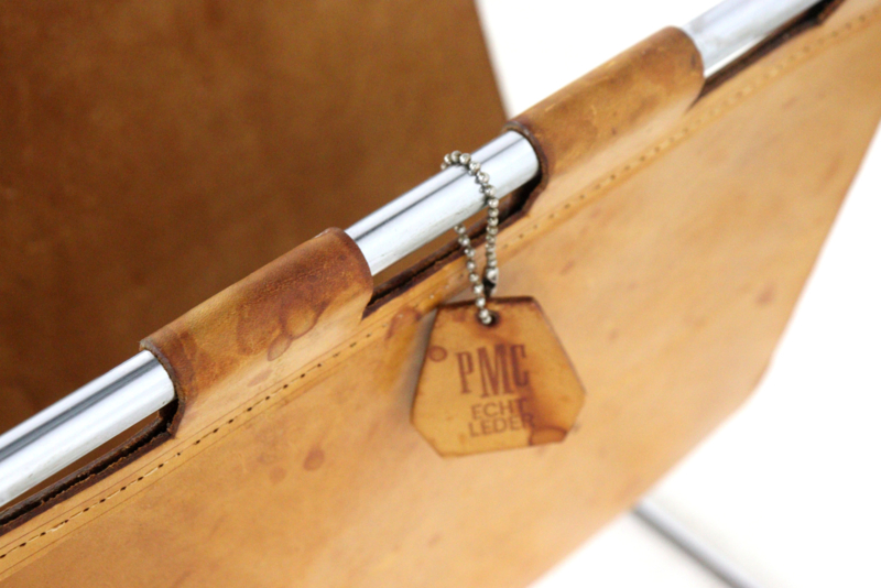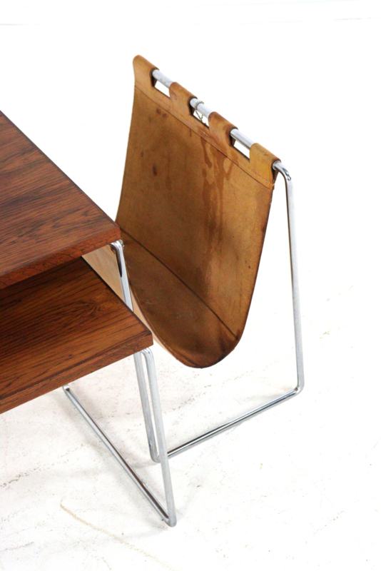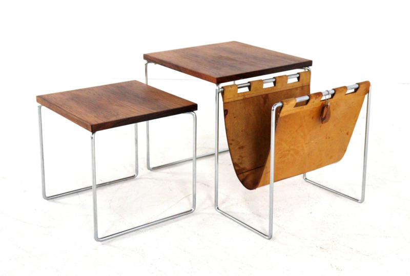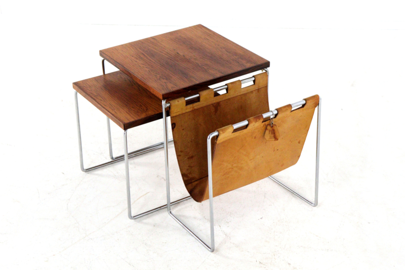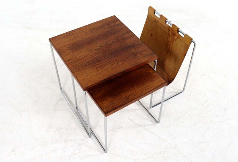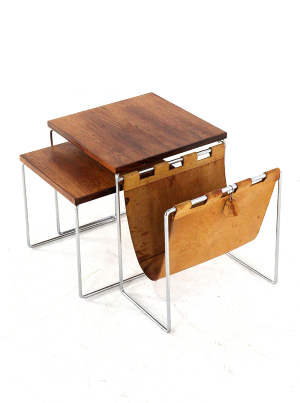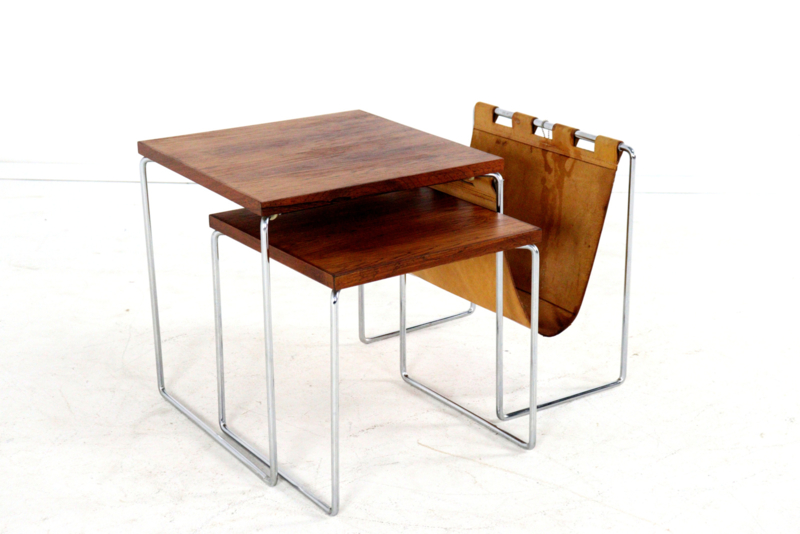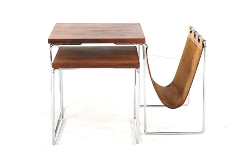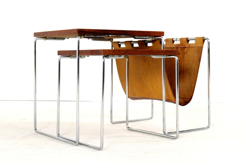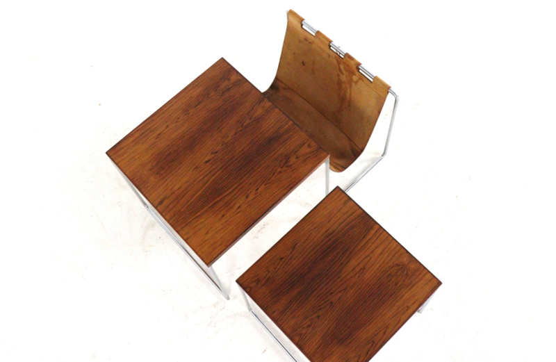 Het meest opvallende aan deze set is de combinatie van het glanzende chromen buisframe met de warme, diepe tekening van de bladen in palissander afwerking. Als uniek extraatje is de grootste tafel voorzien van een geïntegreerde lectuurhouder van prachtig cognackleurig leer.