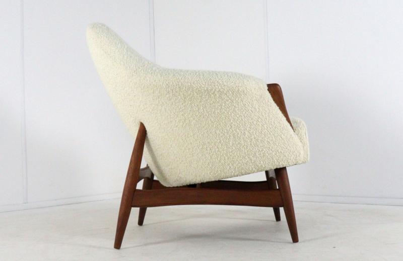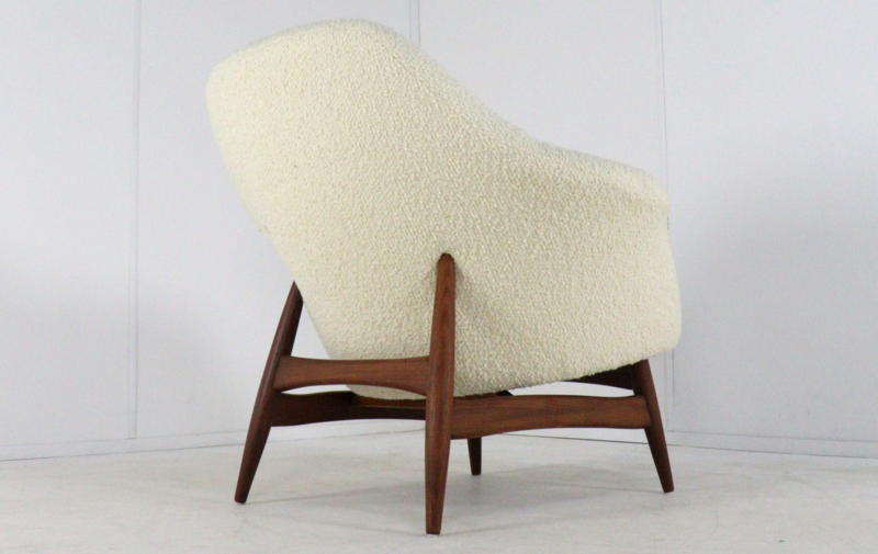 Deze fauteuil verkeert in een conditie die mooier is dan nieuw. Het volledige houten frame is onder handen genomen en teruggebracht in zijn oorspronkelijke pracht. Voor de stoffering is gekozen voor een hoogwaardige witte wollen bouclé. Deze stof versterkt de zachte, ronde vormen van de kuip en biedt een rijk contrast met het warme hout. De textuur van de bouclé geeft het meubel een moderne, bijna aaibare uitstraling die perfect past bij de huidige interieurtrends.
