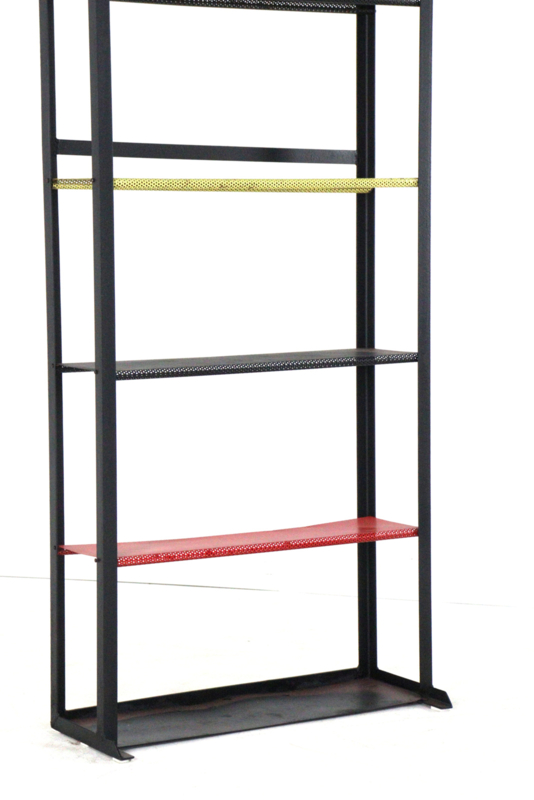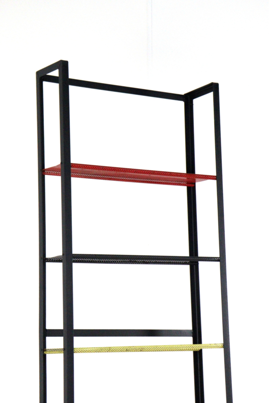 Het slanke stalen frame geeft het meubel een lichte, open uitstraling, terwijl de strakke lijnen zorgen voor een helder en tijdloos silhouet. De combinatie van zwart staal met subtiel geperforeerde legplanken geeft de kast een grafisch en speels karakter.