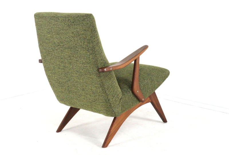 Het volledig gerestaureerde teakhouten frame kenmerkt zich door mooie, sculpturale lijnen waarbij armleuningen en poten neen mooie combinatie vormen. Deze constructie geeft de stoel een lichte, ruimtelijke uitstraling, terwijl het massieve hout tegelijk stabiliteit en duurzaamheid garandeert.