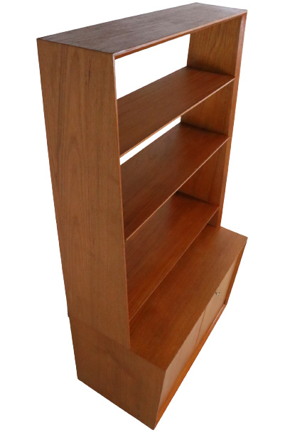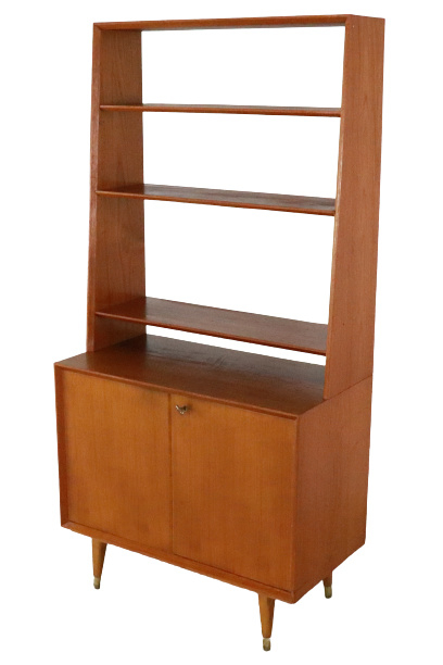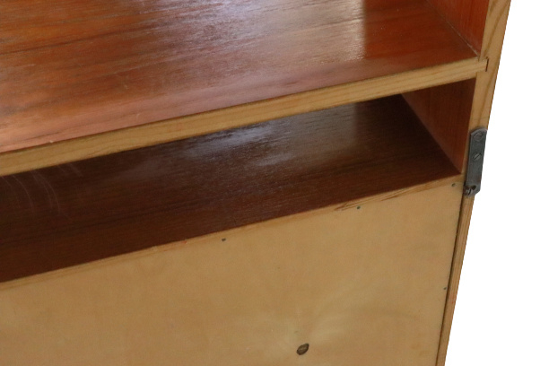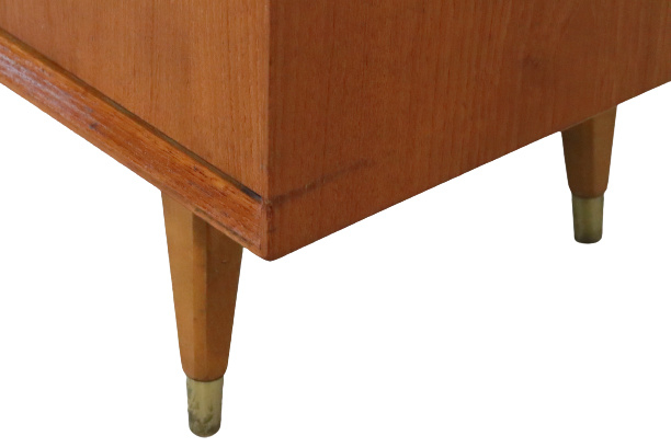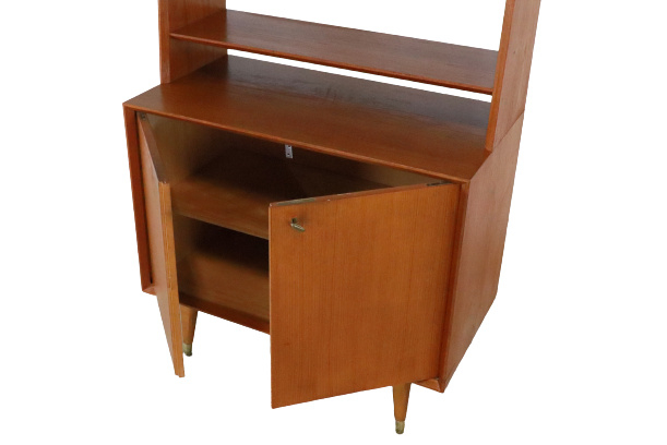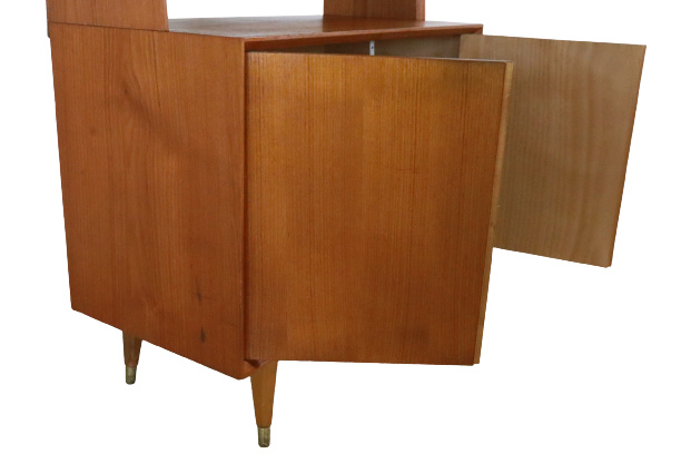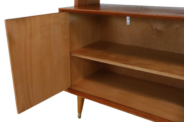 We zien een onderkast met deuren en erachter een fijne eventueel in hoogte verstelbare legplank. Zeer fraai is ook de strakke, vlakke afwerking van de voorzijde en de mooie pootjes met mooie voetjes.